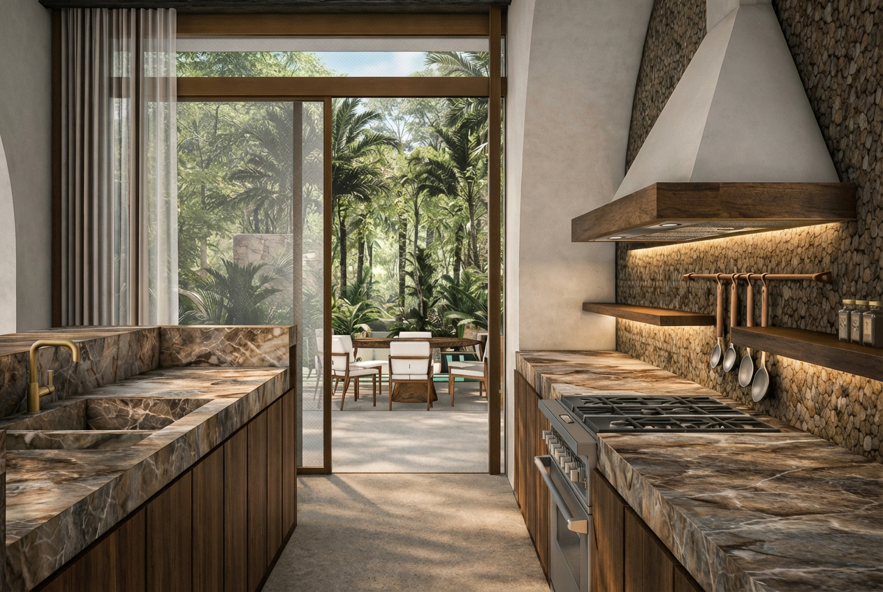 Piscine avec bord en pierre naturelle Palapa traditionnelle Artisanat local intégré Cheminée extérieure Suite master avec bain extérieur Cave à vin